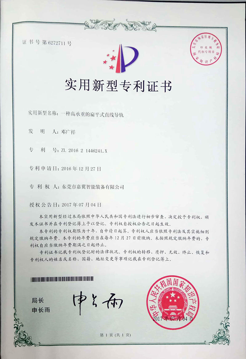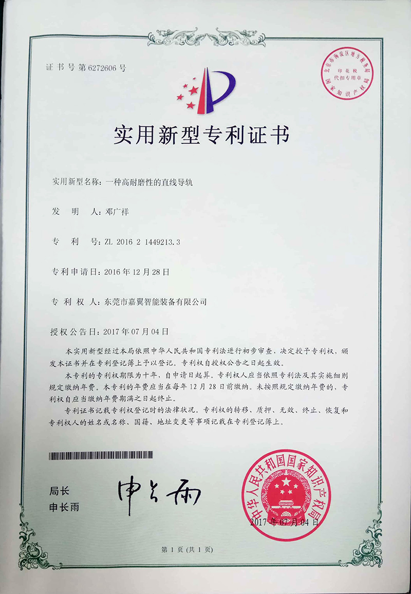 直线导轨实用新型专利证书